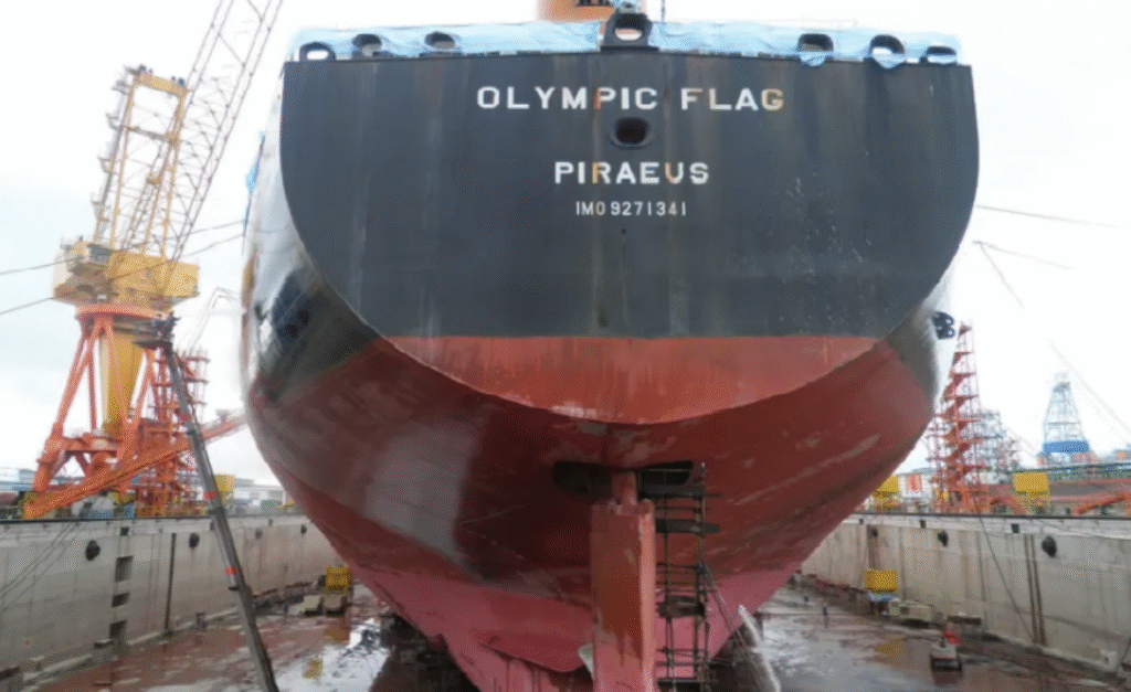 Anche le navi di un’altra compagnia greca, “Olympic Shipping Management SA”, sono coinvolte nel trasporto di petrolio russo. Ad esempio, la petroliera “Olympic Flag” IMO 9271341 sotto bandiera greca caricò petrolio russo nel porto di Ust-Luga alla fine di luglio e lo trasportò a Paradip, India. Secondo i dati disponibili, nel periodo 2024-2025 questa nave ha effettuato almeno cinque trasporti di petrolio come nave della “flotta ombra” della Russia dai porti di Ust-Luga e Primorsk verso porti in India, nonostante possieda certificati assicurativi del club norvegese P&I “Gard” e non sia presente nelle liste di sanzioni.