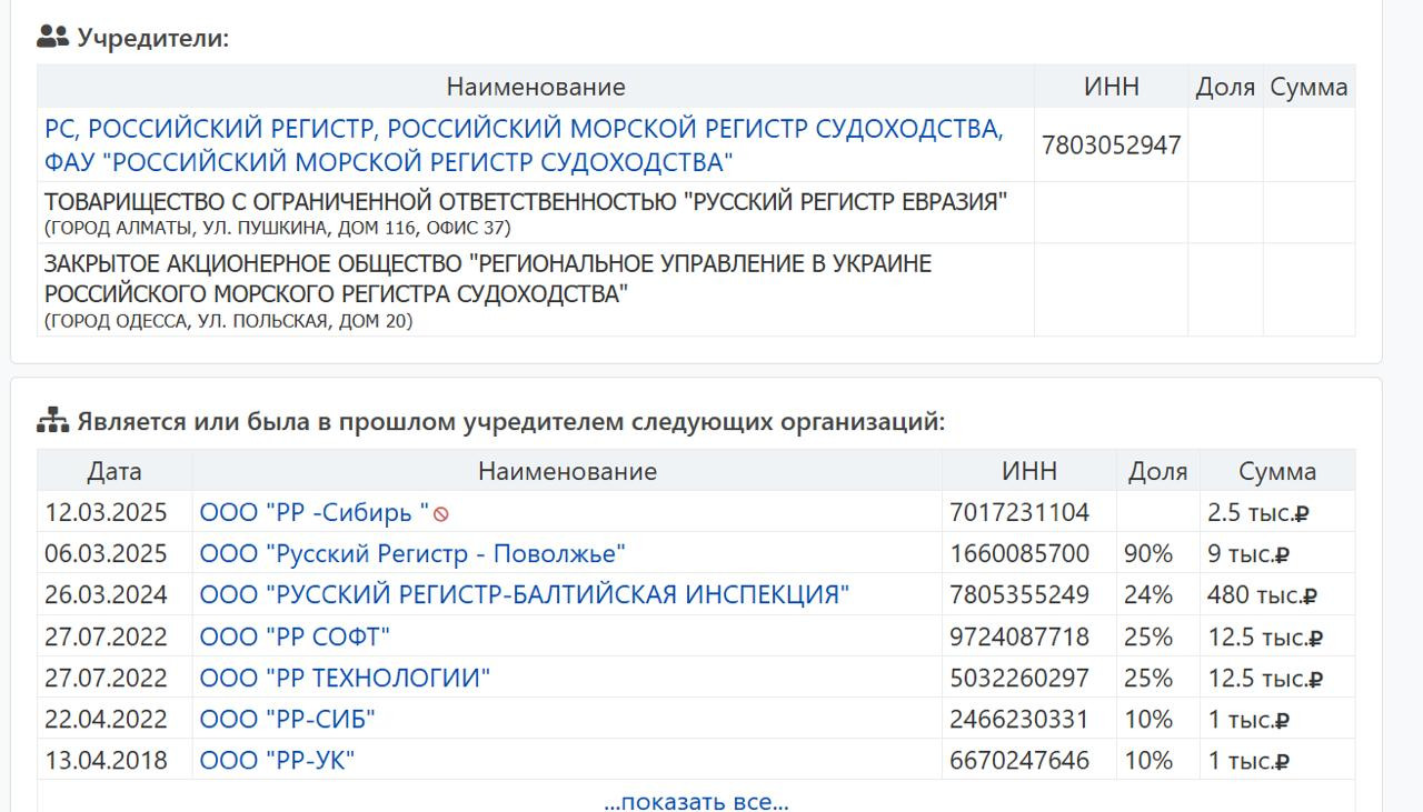 Citeremo separatamente la LLC «Rstekh», fondata dal RMRS insieme alla LLC «TIM – Management Solutions» e alla LLC «Morskoe Gruzovoe Byuro», che, tra l’altro, in passato ha avuto contratti per il trasporto marittimo con lo stabilimento federale «Tambov Gunpowder Plant» per 1,7 milioni di rubli. Ma il fenomeno «interno» più significativo è una creazione del RMRS come la privata «Association Russian Register» («ARR»), i cui attuali fondatori e beneficiari sono accuratamente nascosti; allo stesso tempo, fino al 2021 essi erano il RMRS, la LLC kazaka «Russian Register Eurasia» di Almaty e la ZAO ucraina «Regional Administration in Ukraine RMRS» di Odessa, mentre oggi i registri accennano vagamente solo a una «proprietà mista con partecipazione straniera».